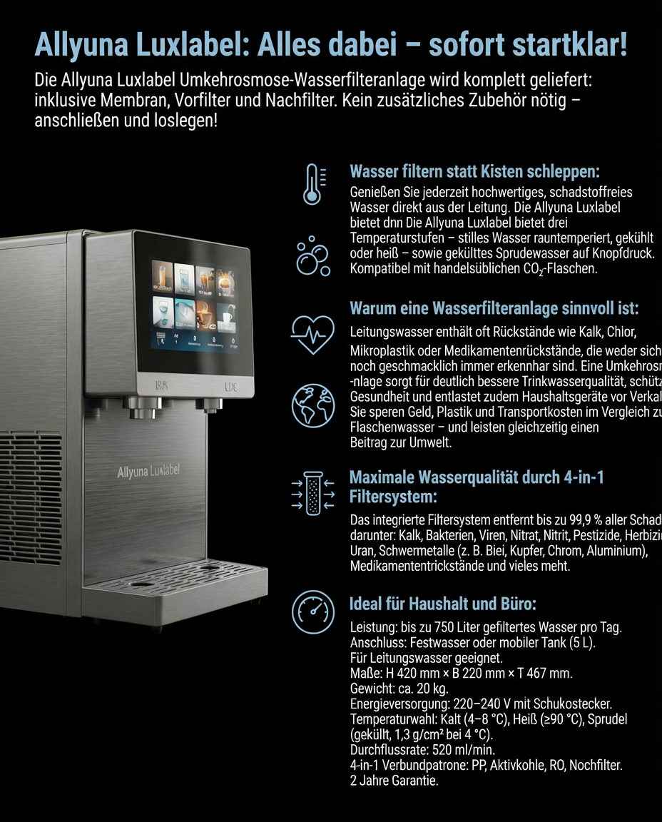 Die Sparkling Deluxe Umkehrosmose-Wasserfilteranlage wird komplett geliefert: inklusive Membran, Vorfilter und Nachfilter. Kein zusätzliches Zubehör nötig – anschließen und loslegen!