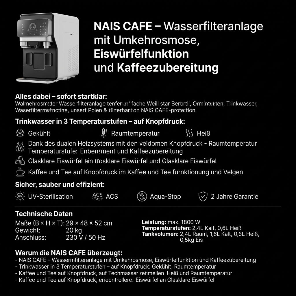 NAIS CAFE – Wasserfilteranlage mit Umkehrosmose, Eiswürfelfunktion und Kaffeezubereitung